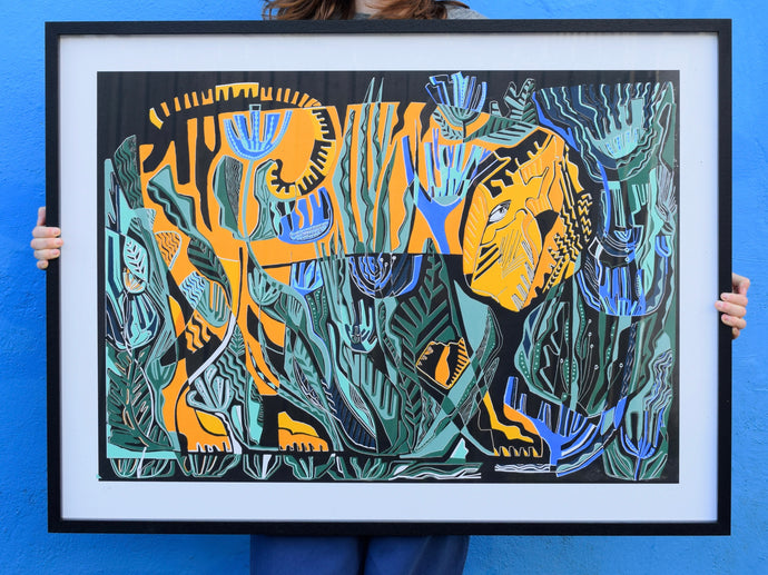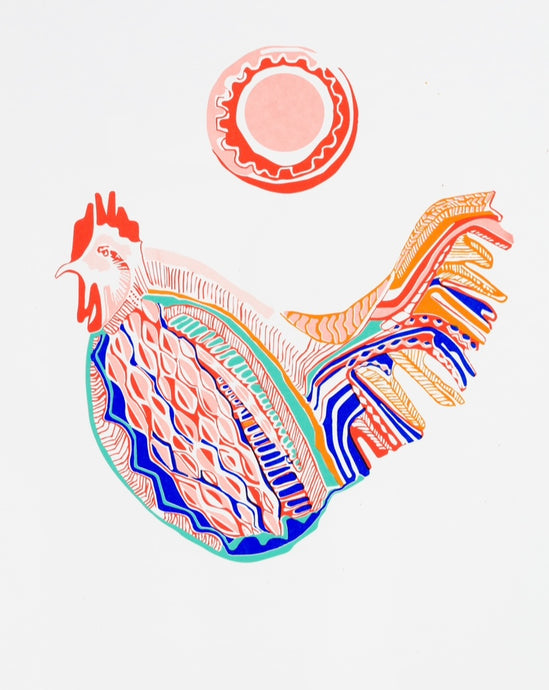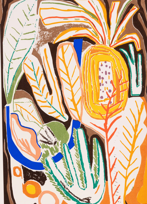 Flora is an artist printmaker based in Cornwall. She graduated with a BA in Textile Design from Falmouth University, where she specialised in print, producing large screen prints in repeat on fabric. She now makes limited edition screen prints on paper: bold, colourful, playful imagery. She is interested in a wide range of subjects and is inspired by the colours and shapes of the natural environment and the world around her. She creates images by experimenting with collage and painting before printing.